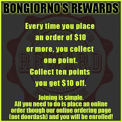 AUTHENTIC FAMILY FLAVOR VIEW MENU ORDER ONLINE ORDER DOORDASH Speaking of parties, Bongiorno’s Pizza Gift cards make an excellent gift for the pizza lover in your life. Stop in anytime to grab one!
