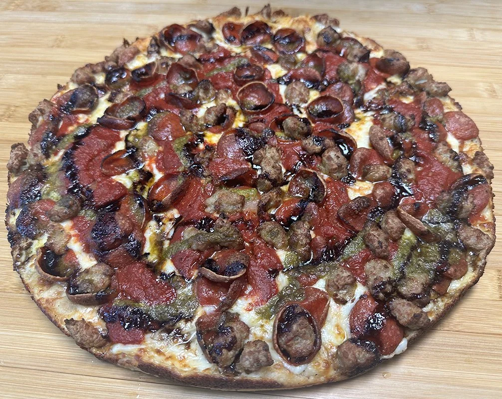 We layer it edge-to-edge with melty mozzarella and savory Italian sausage, then top it with our new "Cup & Char" pepperoni, which curls into crispy, oil-filled chalices in the heat of the oven. Instead of a messy base, we lay down thick, signature rows of our homemade pizza sauce across the top. To finish the "strangle," we lace the entire pie with heavy swirls of bright basil pesto and a tangy balsamic glaze for a sweet-and-savory finish that will leave you breathless.
